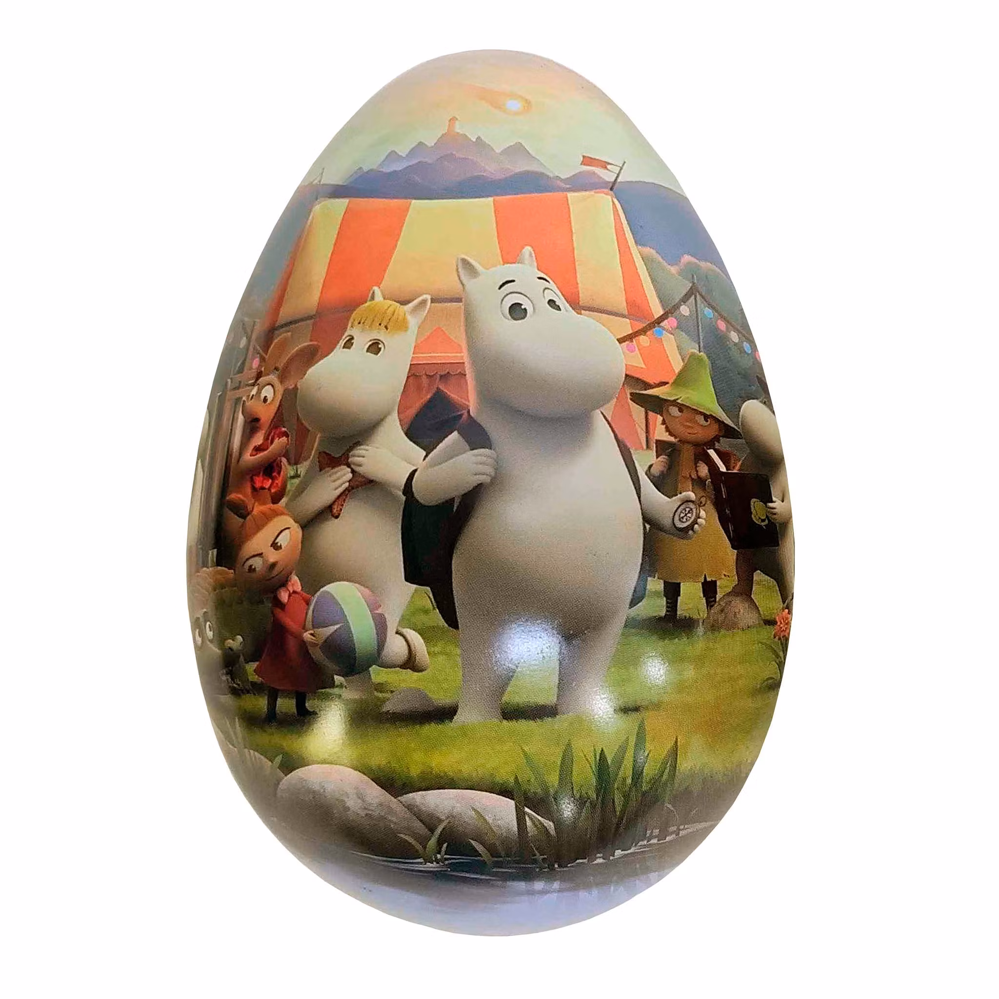 Påskägg i plåt med vackra Mumin-illustrationer.