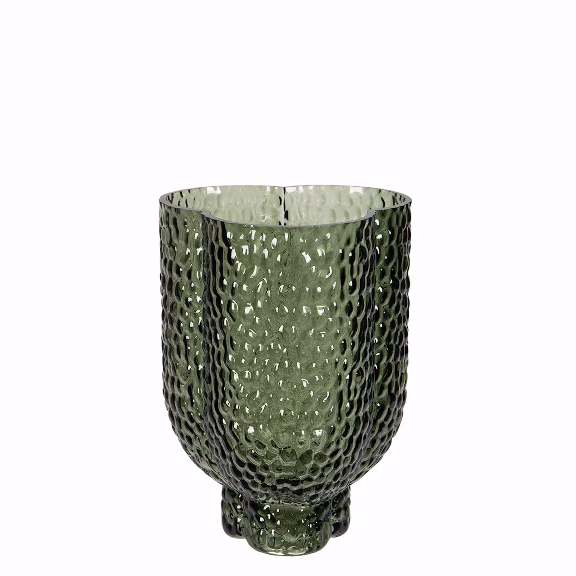 En vas i glas formad som en trebladsblomma. Elegant "bubblig" yta som fångar upp ljuset på finast sätt. En riktig statementpiece! För dig som älskar att ha blommor och buketter eller varför inte tända ett ljus i den för effektfullt sken. Finns i 2 storlekar.