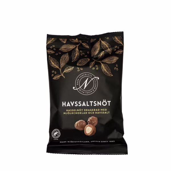 Hasselnötter dragerade med mjölkchoklad (85 %) och havssalt.