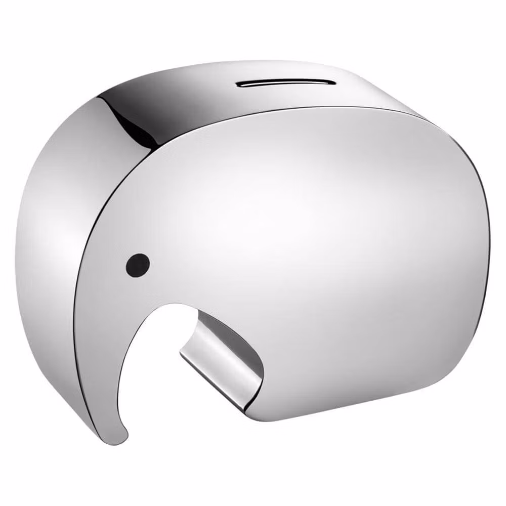 1987 formgav Jørgen Møller och hans barnbarn en elefantflasköppnare, som blev en favorit i hela världen. Fler modeller med elefanttemat följde, som den här nyckelringen. I år har Møller jobbat med sitt barnbarnsbarn och kommit på denna fina sparbössa.