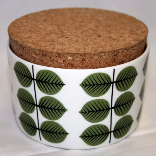 Burk i benporslin med transparent glasyr och dekoren Berså med tillhörande korklock.
