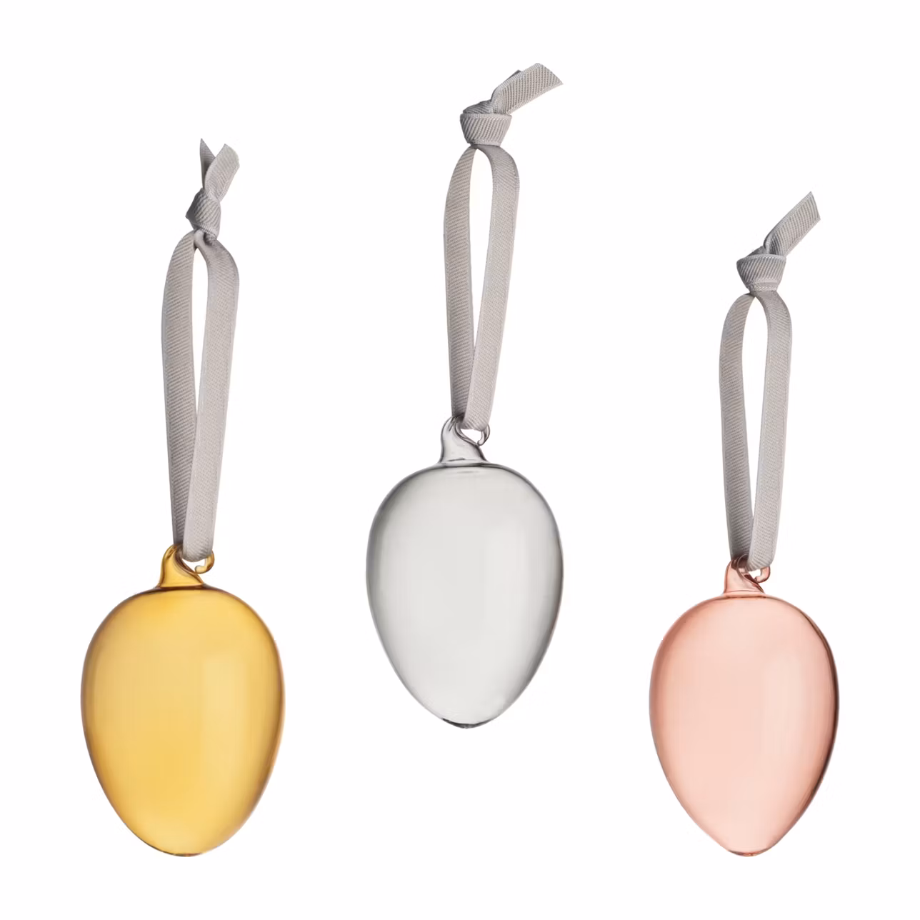 Iittalas färgstarka nya trepack med glasägg skapar påskstämning i alla miljöer. De varmt gula, läckert grå och elegant puderfärgade äggen reflekterar ljuset på ett vackert sätt. Eleganta grå tygband för upphängning medföljer. En fin minnessak till påsken eller en omtänksam gåva.