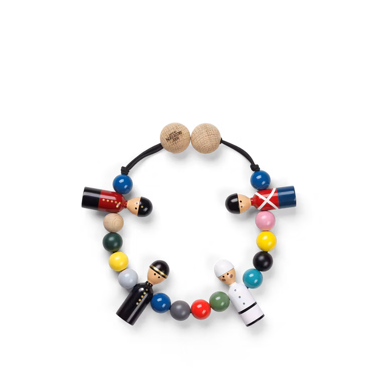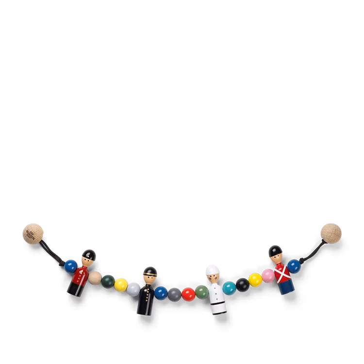 Gör promenaden ännu mysigare genom att pryda barnvagnen med denna fina mobil i målad bok från Kay Bojesen. Mobilen har färgade träkulor och små fina träfigurer