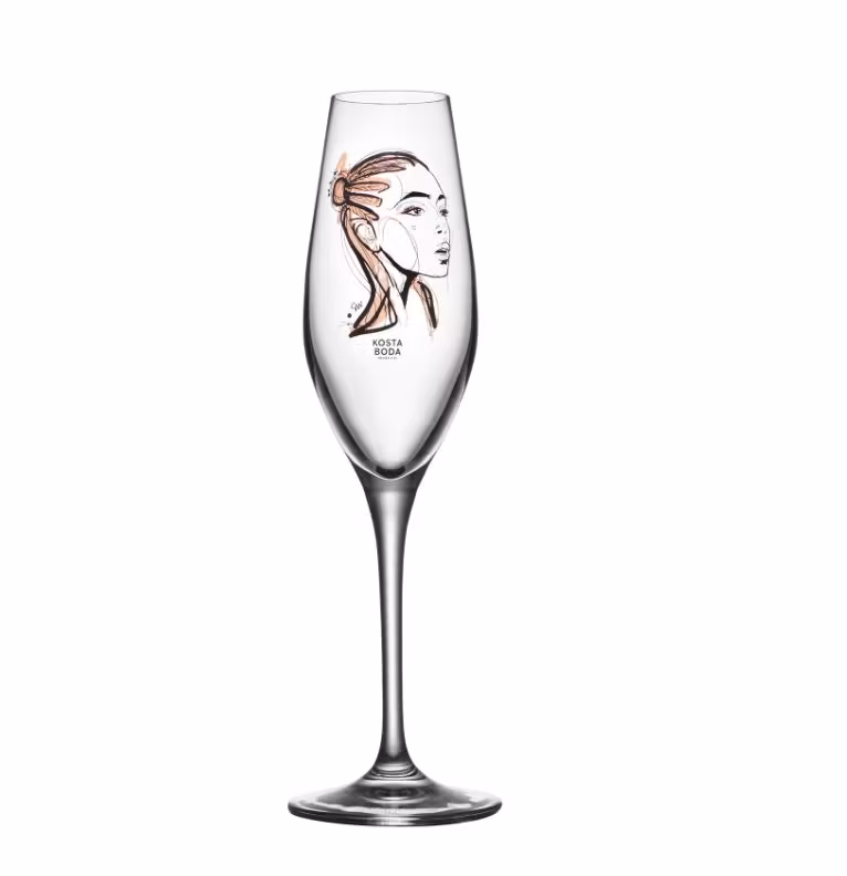 Champagneglasen i serien All About You från Kosta Boda handlar om kärlek, längtan och passion - starka känslor fångade i glas med sparsmakad design och illustrerade motiv med influenser från modevärlden. Glaset Forever Yours har färgen Dusty Pink, som här symboliserar romantik. Design Sara Woodrow.