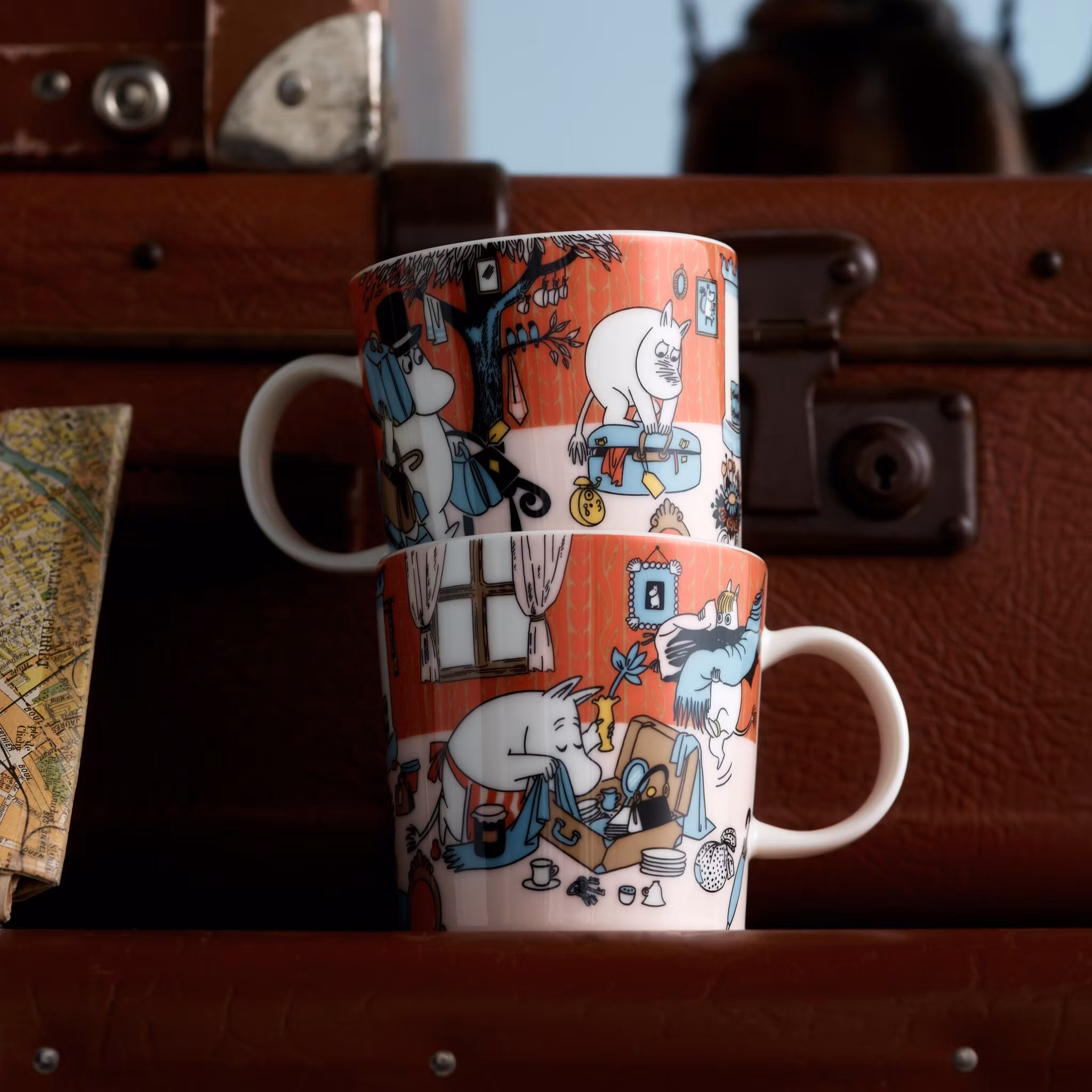 MoominArabia Muminmugg Redo för semester är årets sommarmugg 2026 – en illustrerad porslinsmugg som markerar starten på den nya Riviera-serien. Motivet är inspirerat av Tove Janssons serie "Familjen lever högt" (1955) och inleder en somrig säsongsberättelse som under de kommande fem åren följer muminfamiljens resa till Rivieran. Här skildras ögonblicket precis innan avfärd, där förväntan, humor och drömmar om ett mer elegant liv möts i en livfull, orange mönstrad bakgrund.MoominArabia Redo för semester muminmugg fångar det välbekanta ögonblicket av sista-minuten-packning: Muminpappan är redo att ge sig av, Mumintrollet kämpar med sin överfulla resväska, Snorkfröken samlar febrilt ihop allt hon önskar att ha med sig och Muminmamman packar omsorgsfullt ner alla nödvändigheter. Illustrationen bygger på Janssons berättelse – delvis inspirerad av hennes egna resor på 1950-talet – och kompletteras med detaljer från andra Muminäventyr.