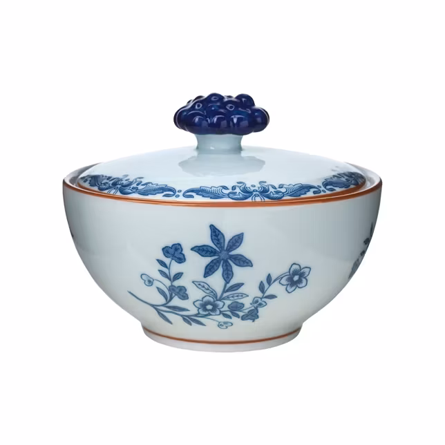 Den traditionella Ostindia-sockerskålen med lock. Duka bordet och kombinera med andra delar av Ostindiaporslin för att skapa en elegant hyllning eller bara en stund med vännerna. Denna klassiska skål bjuder på godsakerna och fulländar eftermiddagsteet. Upptäck ursprunget till porslin i en tidlös design med blått blommönster.