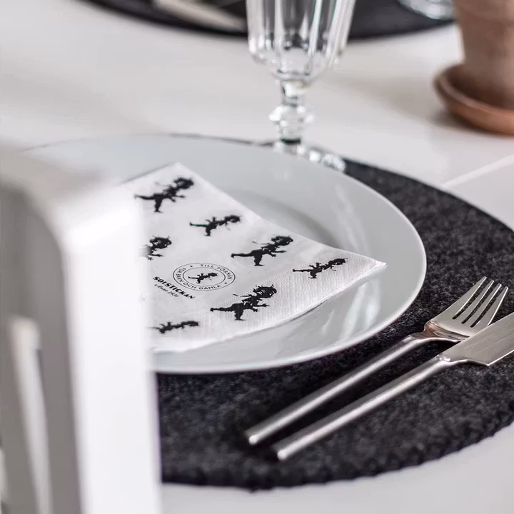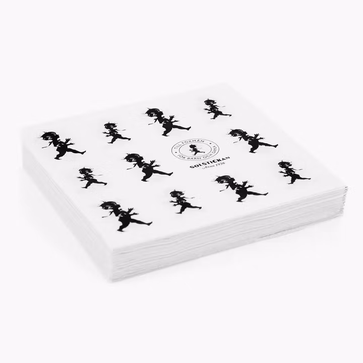 Servett med repeterande mönster med avbildning av den klassiska Solstickepojken skapad av Einar Nerman 1936. Ett fint komplement som lyfter dukningen.